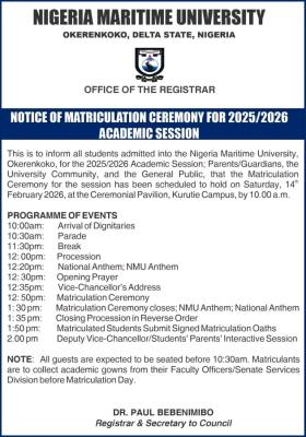 The Office of the Registrar at Nigeria Maritime University (NMU), Okerenkoko, Delta State, has formally announced the Matriculation Ceremony for students admitted during the 2025/2026 academic session. This significant institutional event is scheduled to take place on Saturday, 14th February 2026, at the Ceremonial Pavilion located on the Kurutie Campus. The university extends an invitation to all newly admitted students, their parents or guardians, the entire university community, and members of the general public to witness this formal induction into the maritime academic world.