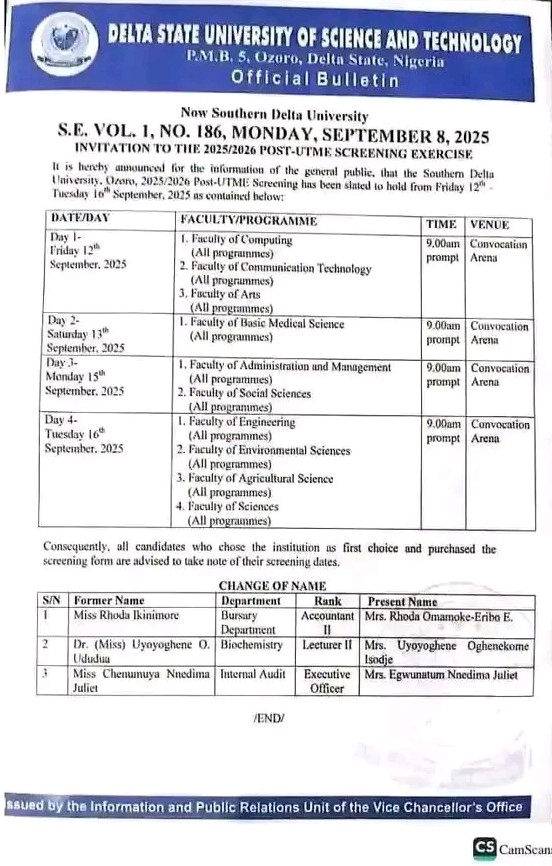 SOUTHERN DELTA UNIVERSITY, OZORO RELEASES POST-UTME SCREENING SCHEDULE FOR THE 2025/2026 ACADEMIC SESSION